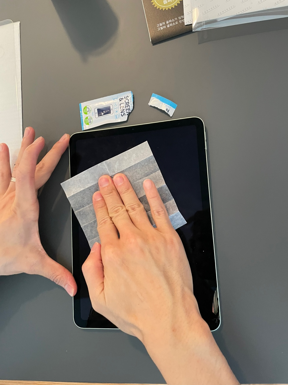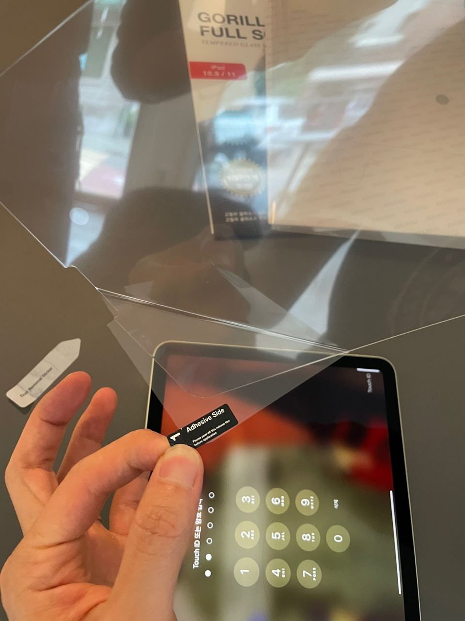 아이패드 필름을 붙여보겠습니다. 고릴라 풀 스크린 제품인데요. 아이패드와 아이폰용 제품 구성항목은 동일하니 같은 방법으로 붙이시면 됩니다.