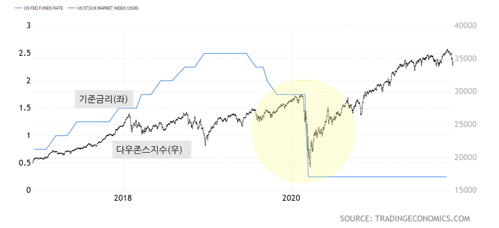 위 차트를 보시죠. 파란색 기준금리 차트를 보시면, 2015년 말부터 힘겹게(?) 올려왔던 기준금리를 '20.3월 0~25bp 수준으로 한 번에 원복, 대폭 인하한 것을 볼 수 있습니다.